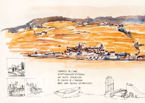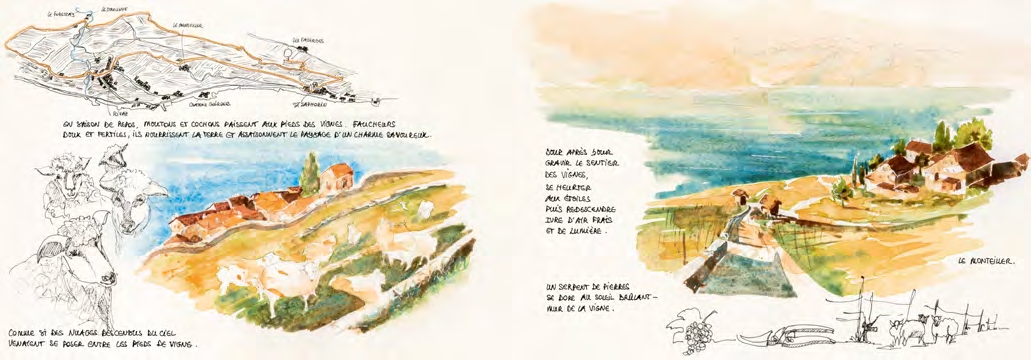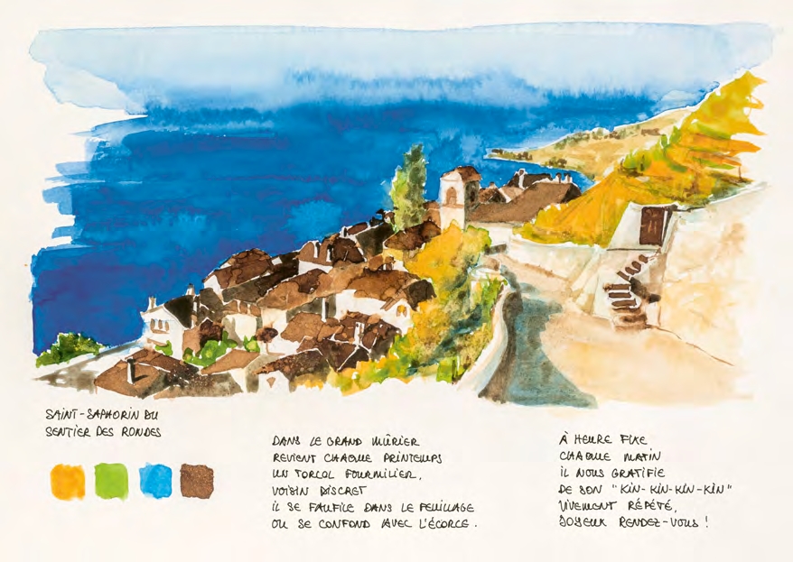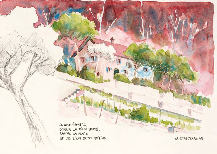 Fruit de dix années de balades dans le vignoble en terrasses de Lavaux, ce carnet d’artiste mêle croquis, aquarelles, notes historiques et textes poétiques. Peintre-carnettiste locale, l’auteure y trace un hommage intime à cette région fascinante, inscrite au patrimoine mondial de l’UNESCO, capturant ses lumières furtives, ses silences, ainsi que les menus détails qu’offre le chemin.