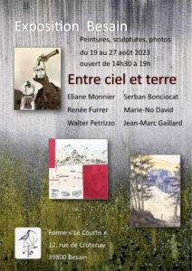 J’ai le plaisir de vous annoncer ma participation à l’exposition collective ENTRE TERRE ET CIEL qui se tiendra du 19 au 27 août 2023, à la Ferme Le Courlis à Besain en France voisine. Ouverture: 14h30 – 19h chaque jour.