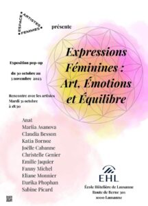 Dans le cadre de l’association Espace Artistes Femmes, j’ai le plaisir de participer à l’exposition collective à l’EHL-Ecole Hôtelière de Lausanne du 30 octobre au 3 novembre 2023, ouverture chaque jour 8h-18h.